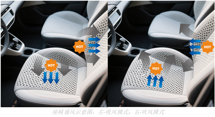 座椅通风系统直接从根源驱散热量,快速降低座椅温度。其内置的座椅风扇运转产生气流,透过导风层均匀从打孔皮面排出(吹风式)或将人体背部的湿热空气抽走(吸风式),加速人体与座椅接触面间的热量交换和汗液蒸发,达到持续降温的目的。