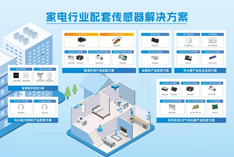 作为中国气体传感器的龙头企业,依托湖北省气体分析仪器仪表工程技术研究中心、湖北省企业技术中心两个技术创新平台,以及博士后科研工作站,将不断深耕技术与产品创新,开发出了众多配套家电行业的传感器及行业解决方案,成为多家家电行业知名企业的核心供应商。产品广泛应用于环境电器、清洁电器、厨房电器等应用领域。其中 环境电器配套产品:A2L/A3冷媒传感器与检测仪、CO2传感器、PM2.5传感器、甲醛传感器、VOC传感器、集成空气质量模组、空气质量检测仪和控制器;清洁电器配套产品:污浊度传感器、灰尘传感器;与厨房电器配套的有油烟浓度传感器、一氧化碳传感器、家用燃气报警器等系列产品,并给予定制化方案。