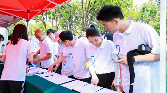 当天清晨,参赛者们便身着统一的运动T恤,在签到处蓄势待发,焕发出青春的活力与热情。工作人员清点人数、引领参赛员工签到领取物资,确保安全措施落到实处。